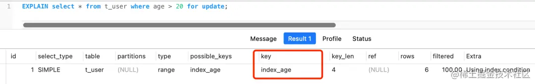 可以看到,对 age 字段建立了索引后,查询语句是索引查询,并不会全表扫描,因此不会把整张表给锁住。
