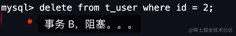 然后, B 事务执行了一条删除 id = 2 的语句: