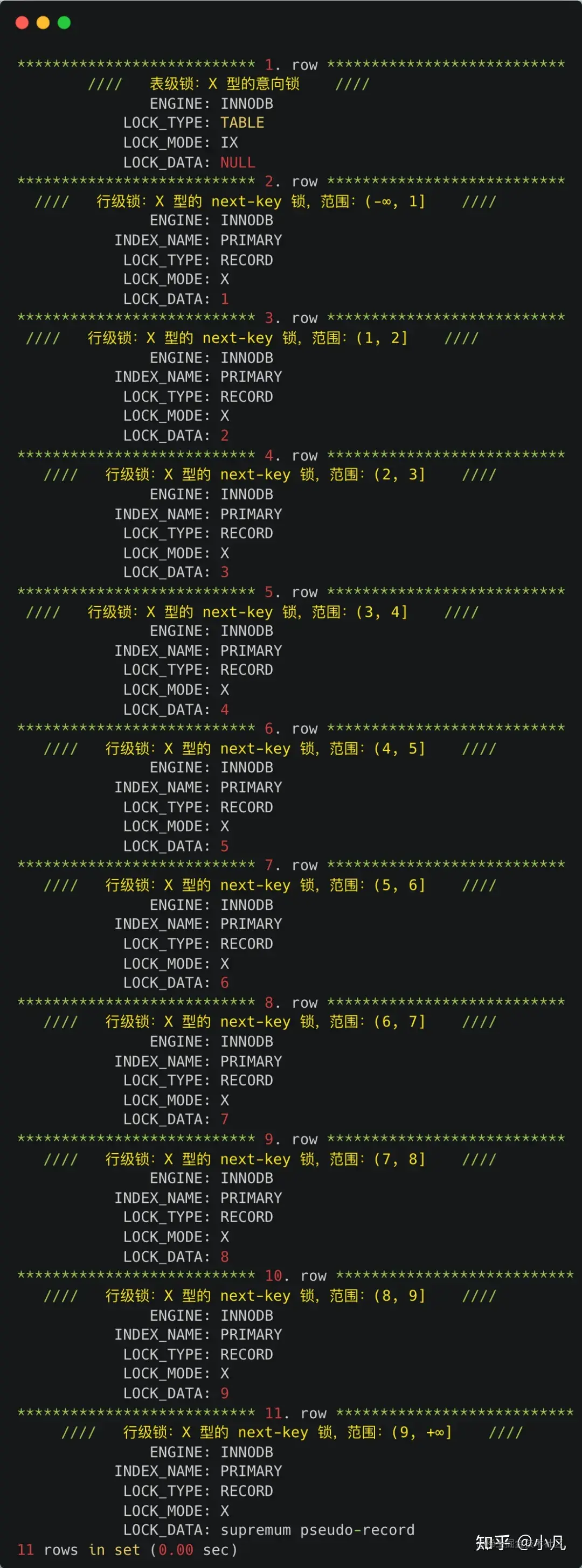 因此,此时事务 A 在主键索引(INDEX_NAME : PRIMARY)上加了 10 个 next-key 锁,如下: