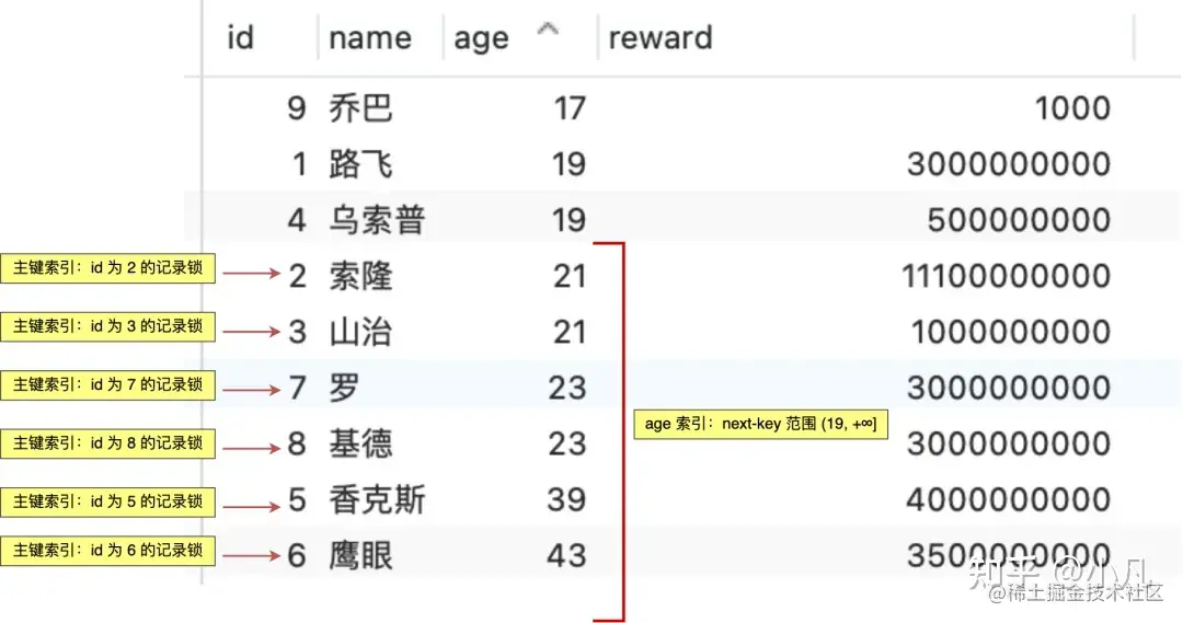 化简一下,age 索引 next-key 锁的范围是 (19, +∞]。