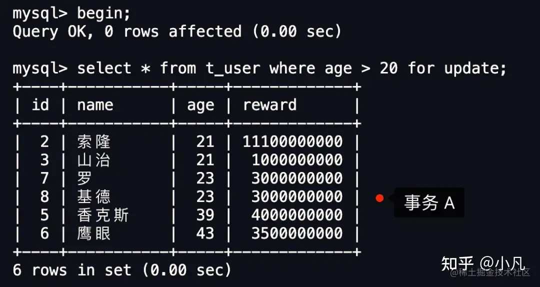 现在有一个 A 事务执行了一条查询语句,查询到年龄大于 20 岁的用户共有 6 条行记录。