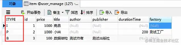 @DiscriminatorValue("I") //该表在鉴别字段列显示的值