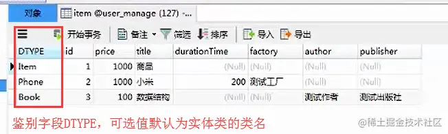 @DiscriminatorColumn(name="ITYPE",discriminatorType=discriminatorType.CHAR) //声明鉴别字段的字段名,类型