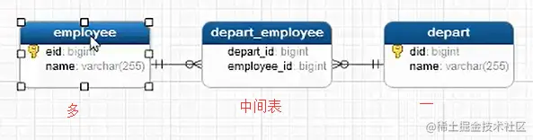 创建中间表(depart_employee),表中存放两个表的主键。通过部门id可查询关联员工的id,三张表存在两个主外键关系。
