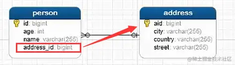 如下例,人员表(person)和地址表(adddress),person表是关系的拥有者,表中的address_id字段关联着address表的主键id。