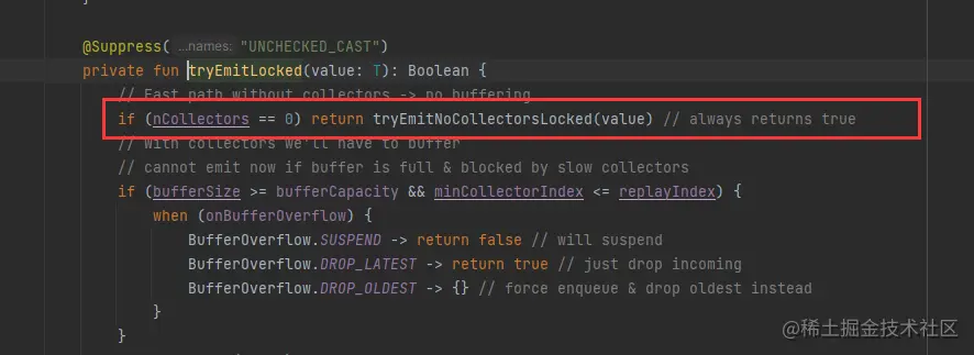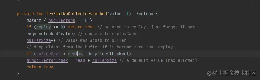 看了实际运行结果,还是出了意外了,两个下游都会收到 4 ,5 ,6 ,为什么会这样呢?read fuck source code,发现因为此时还没有订阅者,所以extraBufferCapacity , onBufferOverflow 这两个参数此时是没效果的 ,当没有下游订阅者的时候,无论emit 多少个数据,都只会缓存replay个最近的数据,超过replay了会把前面老的已缓存的数据丢弃,源码如下 。