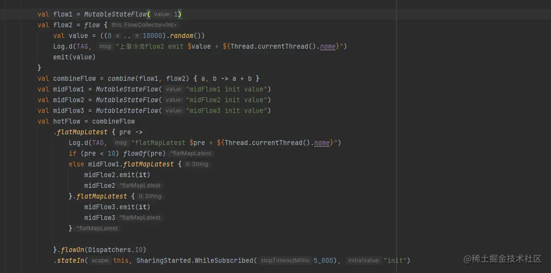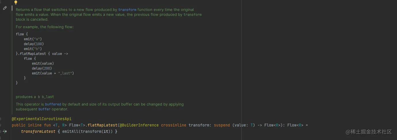根据注释,我们可以看到 flow 发射的数据会经过flatMapLatest 中的那条流,所以最终到下游的数据全取决于flatMapLatest中的那条流。