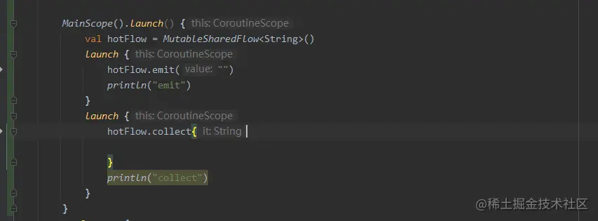 关于StateFlow 这个value 的作用后面详细分析,我们先来看下SharedFlow 共享热流 ,为什么叫共享流后面看完的分析就能理解其共享的含义了,我们先来看看SharedFlow的使用吧。官方给我们提供了MutableSharedFlow 方法 ,用来生成一个可读可写的共享热流,可读是指下游可订阅collect , 可写是指上游可发送数据emit,如下