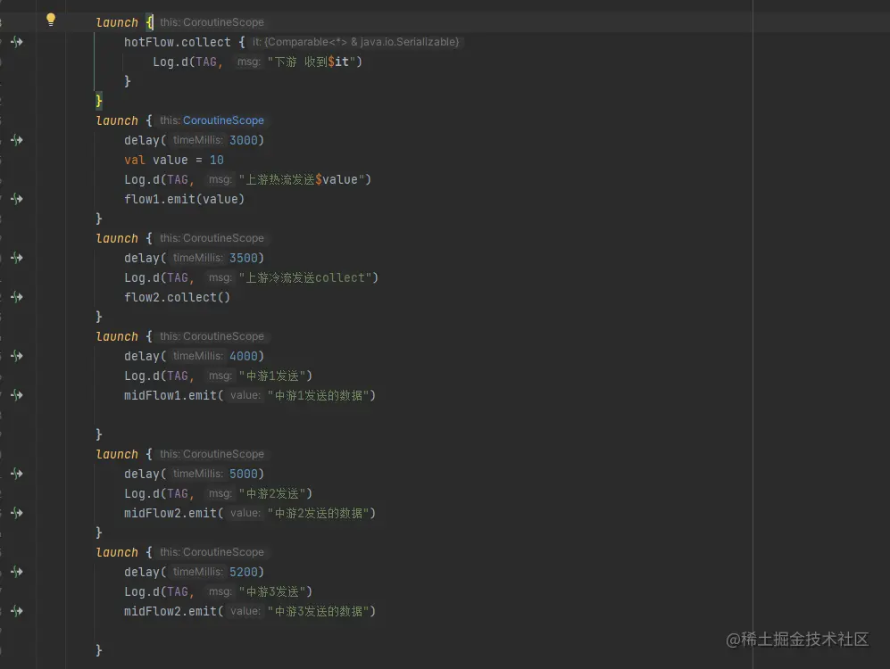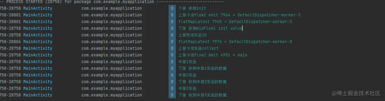 上游热流flow1发送了数据,中游能收到,但是下游收不到,下游之所有收不到数据是因为热流发送的 10 + 第一次冷流的数据7964 大于 10 了,再一次执行midFlow1.flatMapLatest 其实啥事没干,没触发midFlow3.emit 动作,只有触发midFlow3.emit 动作下游才会收到数据,也就解释了中游发送数据为什么下游都能收到。