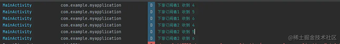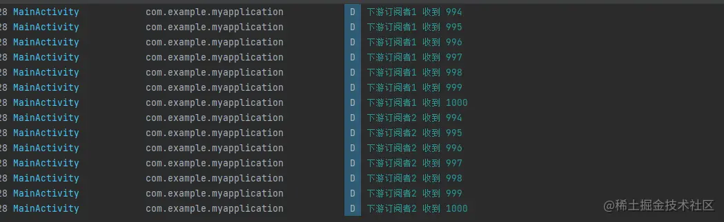 实际运行两个下游订阅者会打印994到1000