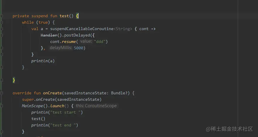 答案是: 会每隔5s 打印ddd,并阻塞不会主线程。因为suspendCancellableCoroutine 方法会挂起当前协程,虽然在主线程执行 ,但是test方法被 return了,while true 跳出了循环。