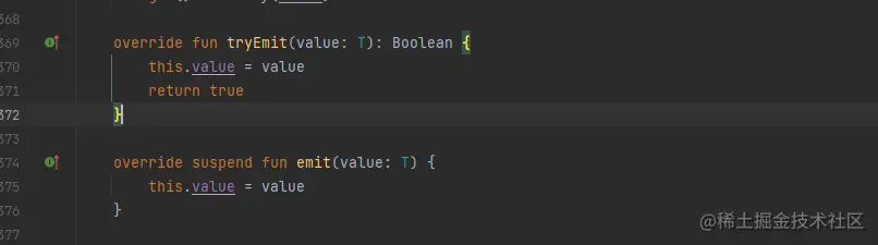 emit方法里面会先调用非挂起的方法tryEmit去发送数据,如果tryEmit发送失败才调用挂起方法 emitSuspend(value) ,tryEmit如下