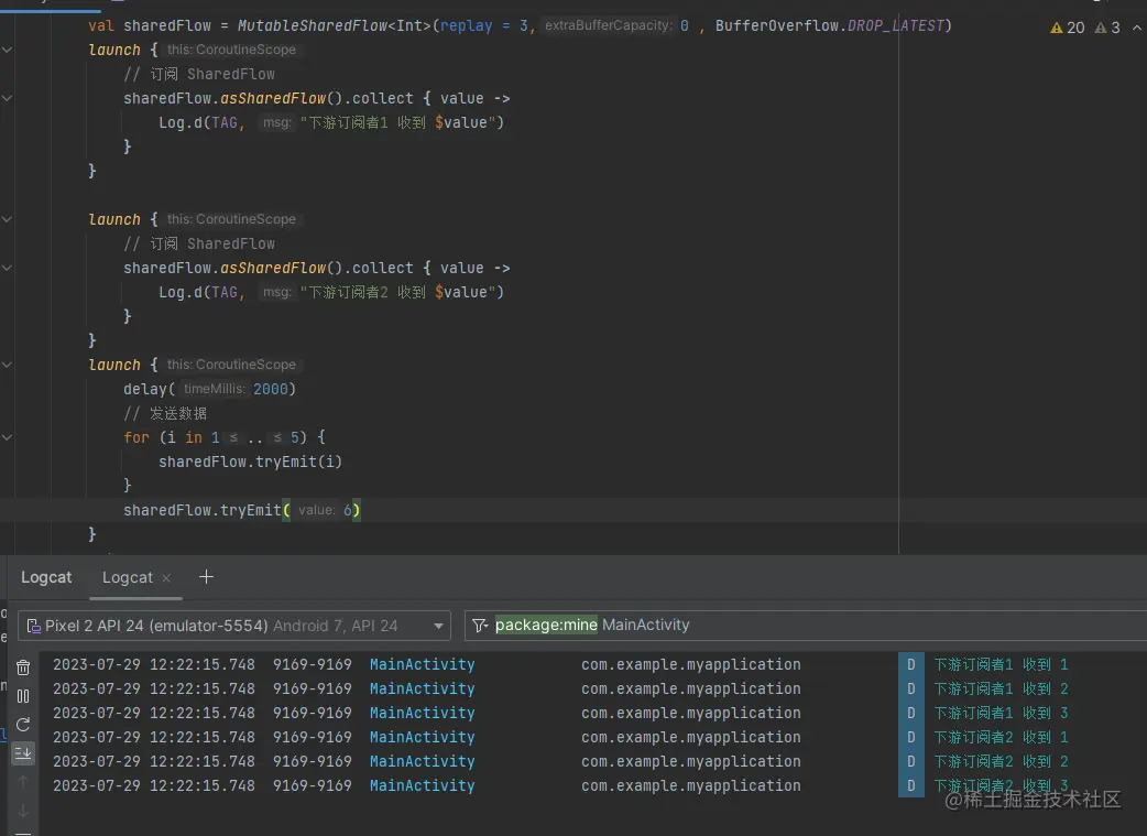 我们使用MutableSharedFlow 来生成一个可读可写的共享热流,将参数replay =3 , extraBufferCapacity = 0 ,onBufferOverflow = BufferOverflow.DROP_LATEST ,表明指定订阅者订阅的时候从缓冲区中读取三个数据,以及额外缓冲区为 0 ,此时最大缓冲区 = 0 + 3 =3, 缓冲区满了策略为不允许新的加入。所以不出意外的话此时运行应该会打印1,2,3,实践出真知,我们运行一把看看。