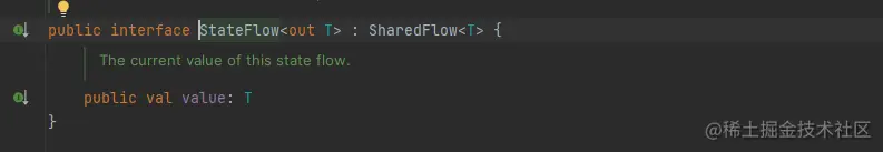 热流和冷流相反,热流会主动产生数据并把数据放入缓冲区,无论下游订不订阅热流都存有数据,根据使用场景有SharedFlow 和 StateFlow , StateFlow继承自SharedFlow ,并且StateFlow 里面有个value ,如下