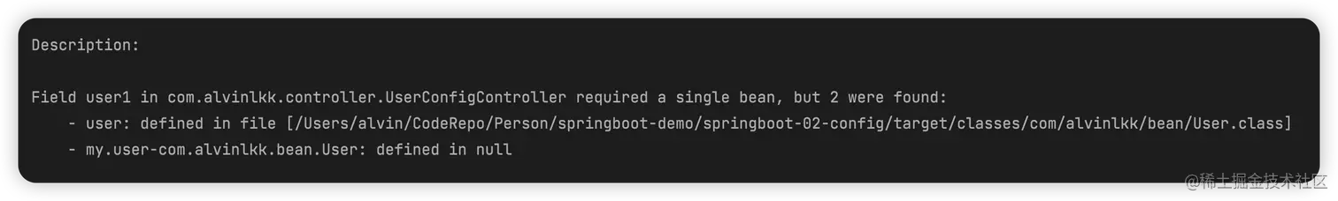 根据报错信息不难分析出来主要原因在于User类在Spring容器中两个Bean对象,bean name分别是“user”和“my.user-com.alvinlkk.bean.User”。