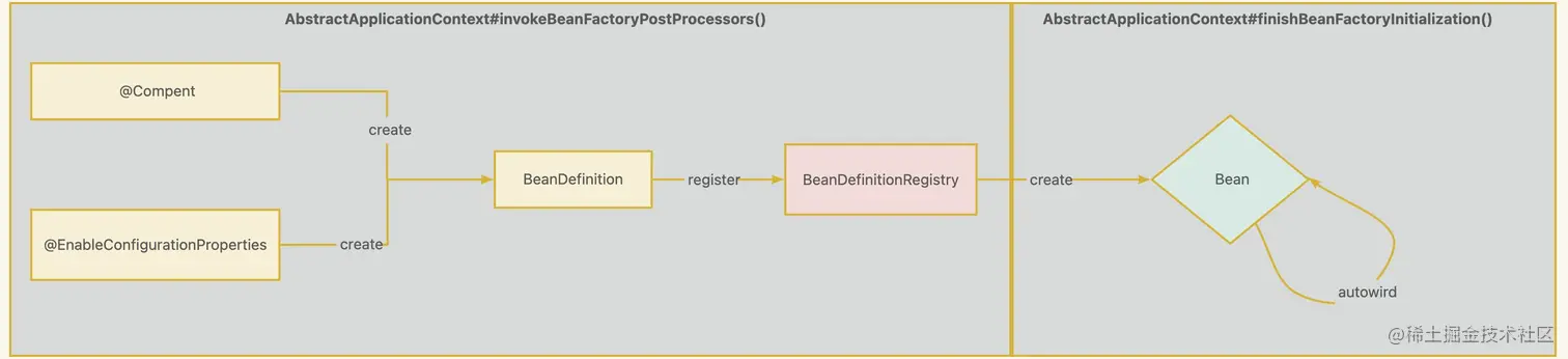上面的两个过程中在通常在SpringBoot启动的过程中就完成,SpringBoot启动的时候,会调用容器的refresh(), 其中在invokeBeanFactoryPostProcessors(beanFactory)方法中创建并注册BeanDefinition, 在finishBeanFactoryInitialization()方法中创建Bean实例对象。