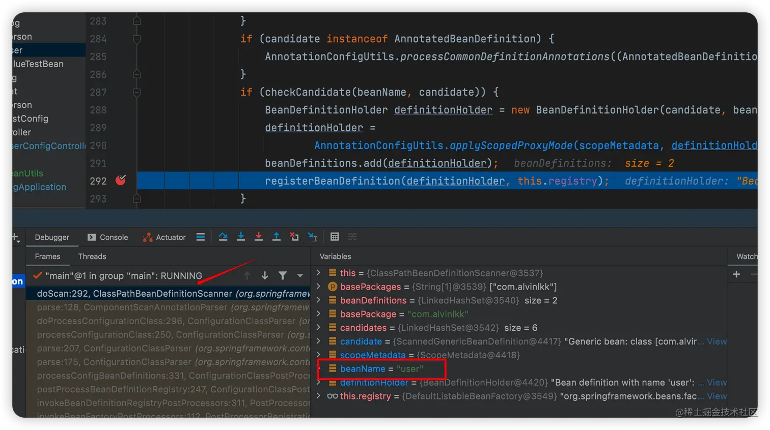 被@Component注解的类User会被扫描到,生成一个名字是user的BeanDefinition,然后注册到BeanDefitionRegistry中,如下图所示: