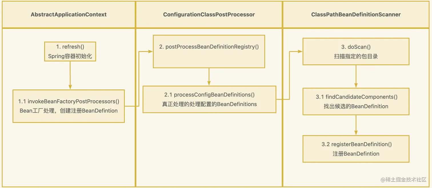 被Compoent注解的的类会被Spring中的ConfigurationClassPostProcessor类处理,创建出对应的BeanDefinition,然后注册到BeanDefinitionRegistry中,具体流程如下图所示。