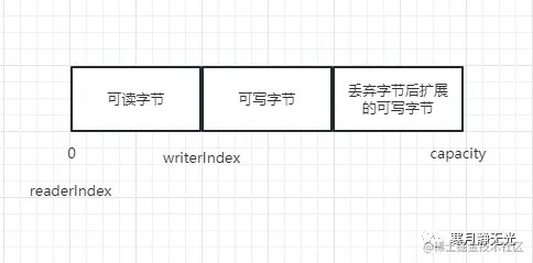 可丢弃字节包含了已经读过的字节,这个分段的初始大小为0,会随着read操作的执行而增加。可以通过调用discardReadBytes()方法来丢弃它们并回收空间,不过这有可能会导致内存复制,因为可读字节需要被移动到缓冲区的开始位置,所以建议只有在真正需要的地方使用,例如内存非常宝贵的时候。