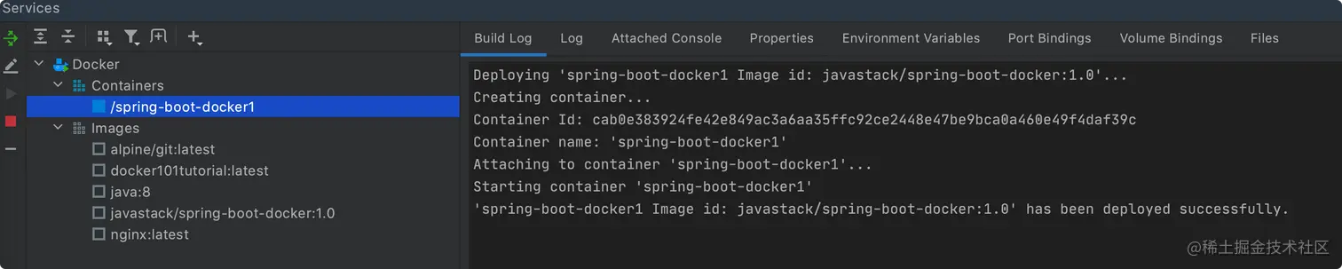 然后在 Build Log 和 Log 面板中可以看到容器运行日志和应用程序运行日志: