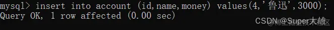insert into account values('001','李白',5000),('002','杜甫',3000),('003','白居易',2500);