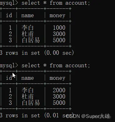 2.5.2.2 模拟转账流程 李白给杜甫转账1000元 (自动提交事务模式)