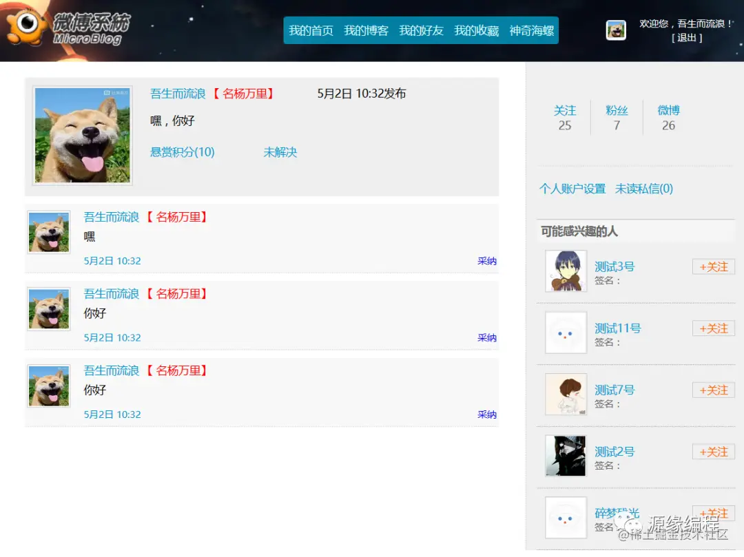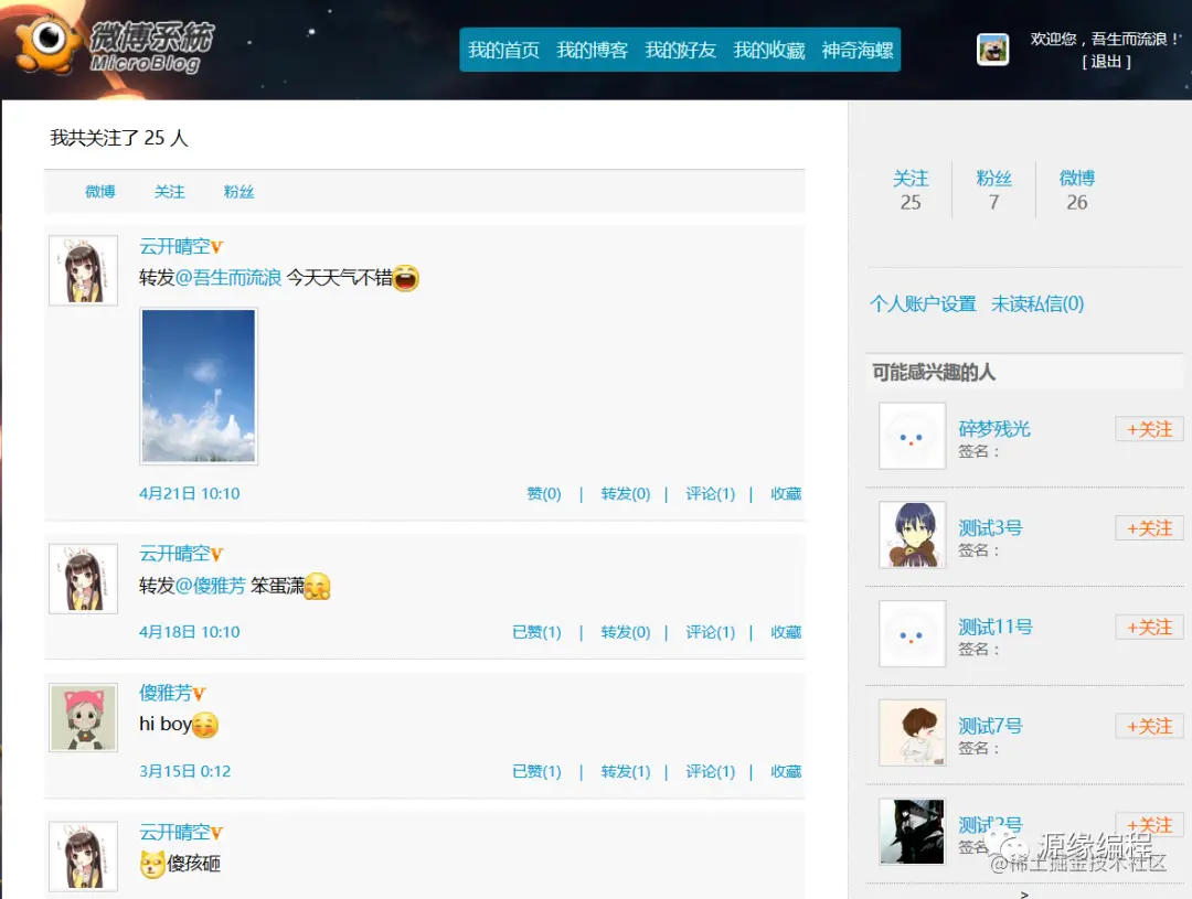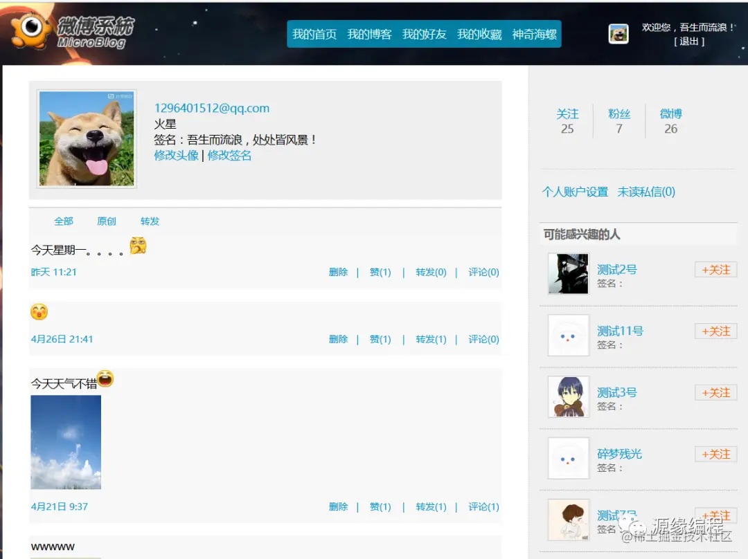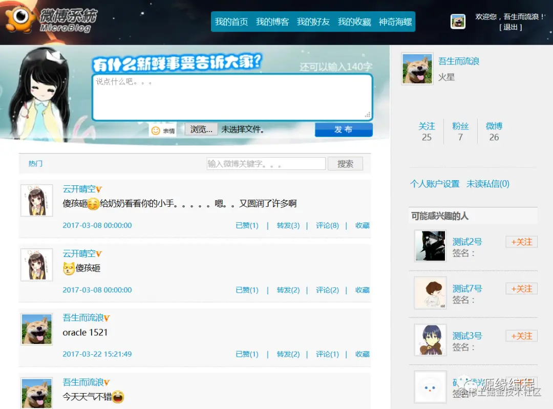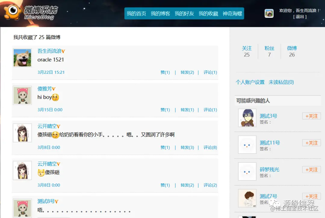 实现微博操作用户可以查看个人微博、好友微博、收藏微博等信息、对微博点赞、转发、收藏、评论、删除等