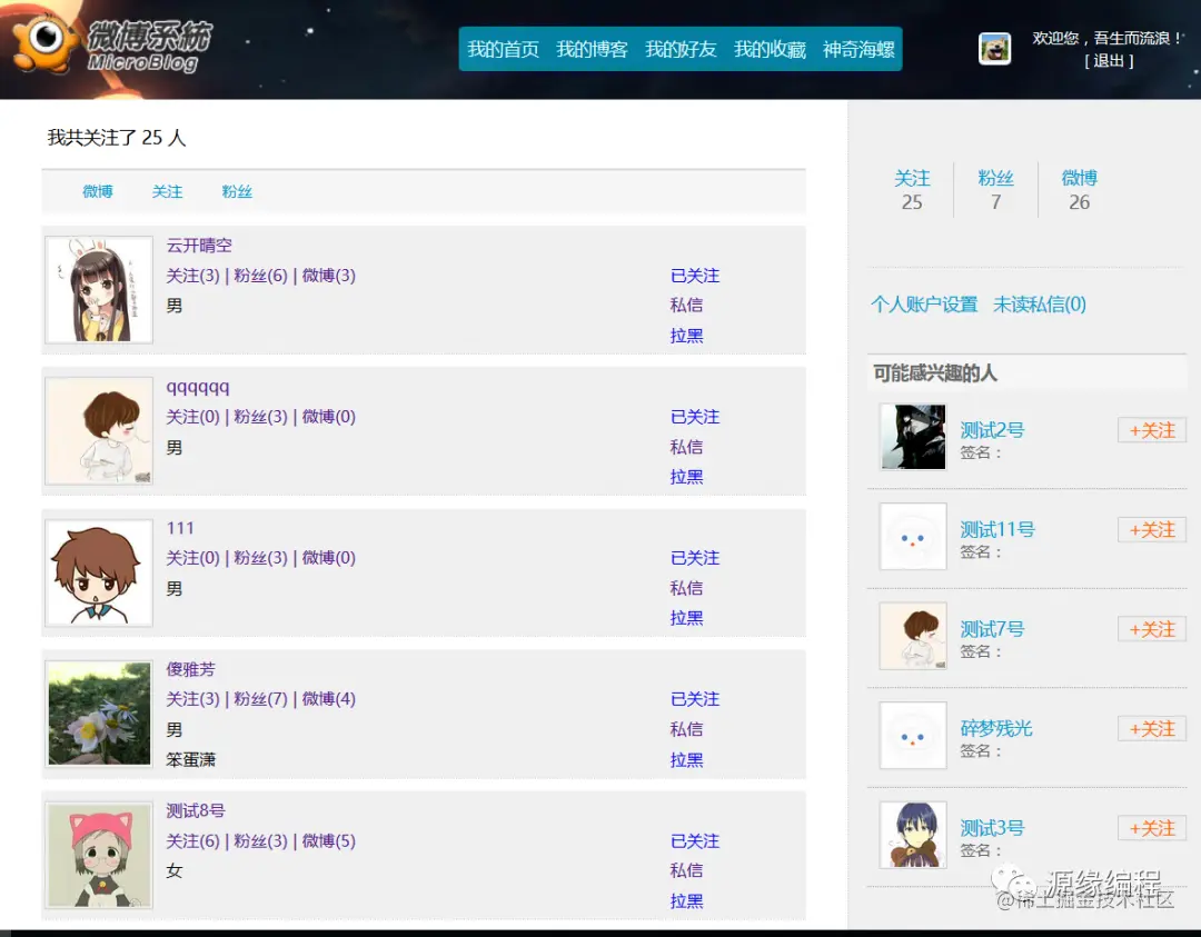 实现用户关注、关注数+1、粉丝数+1、取消关注、拉黑用户、私信搜索用户等等;