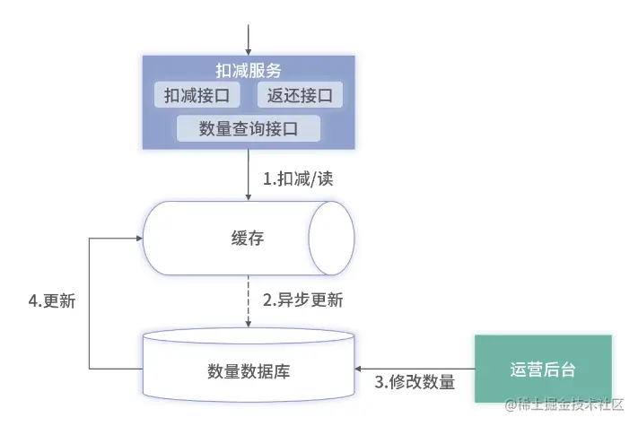 最后,在存缓存的架构中还有一个运营后台,它直接连接到数据库,是运营和商家修改库存的入口。