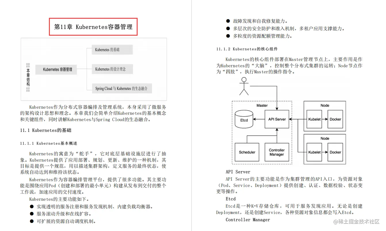 Kubernetes作为分布式容器编排及管理系统,本身采用了微服务的架构设计思想和理念。本章我们会简单介绍Kubernetes的基本概念和关键组件,同时讲解Kubernetes与Spring Cloud的生态融合。