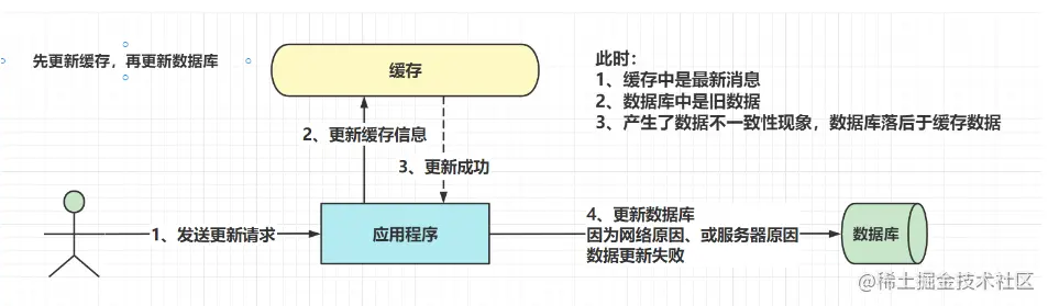 如果更新数据库成功了,而删除缓存失败了,那么数据库中就会是新数据,而缓存中是旧数据,数据就出现了不一致情况。