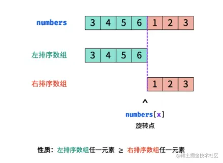 如下图所示,寻找旋转数组的最小元素即为寻找 右排序数组 的首个元素 numbers[x] ,称 x 为 旋转点 。