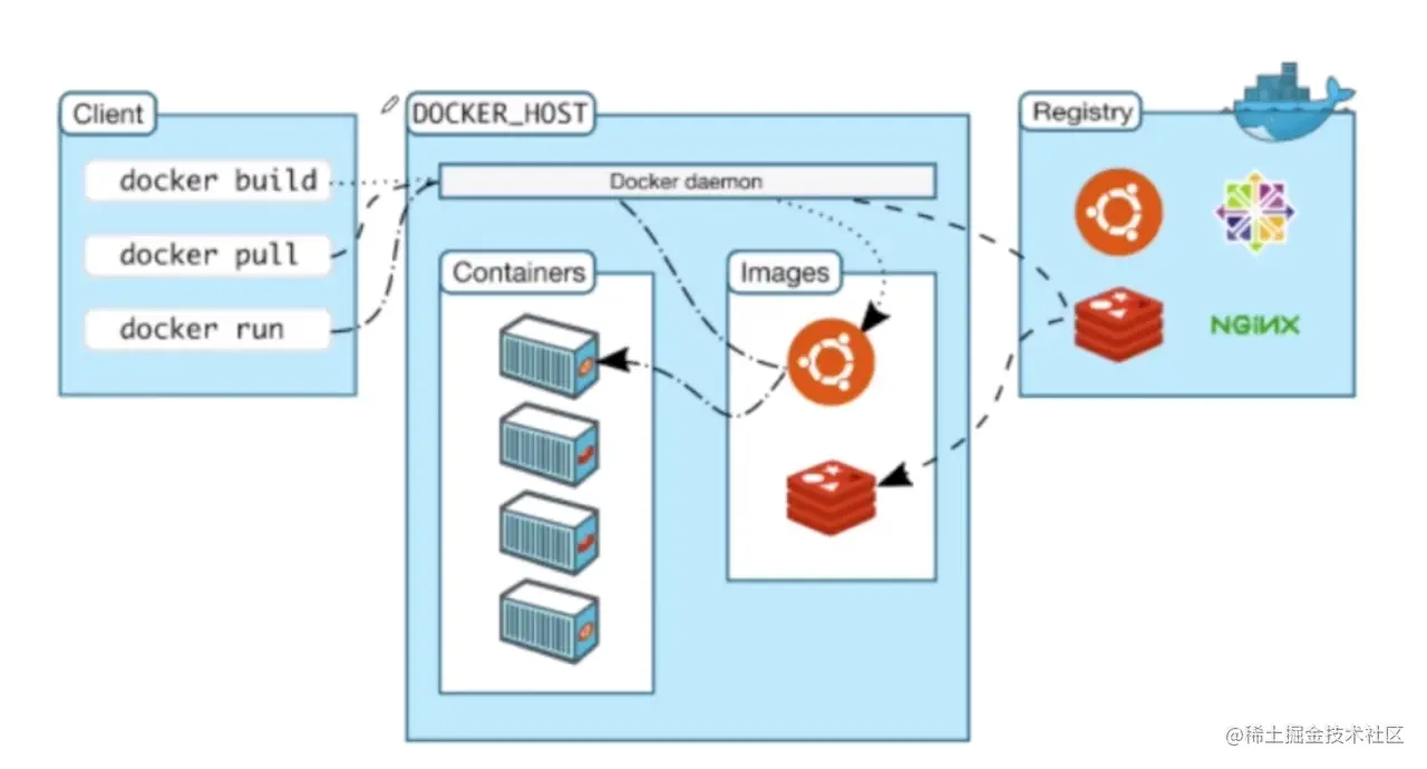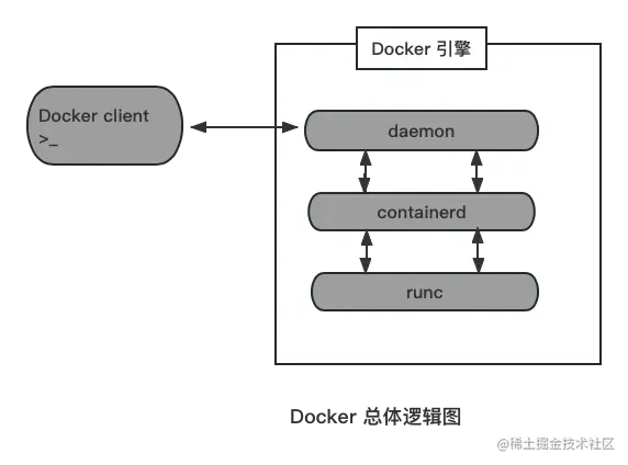 Docker 引擎 由如下主要的组件构成:Docker客户端( Docker Client) 、Docker守护进程(Docker daemon)、containerd 以及 runc。它们共同负责容器的创建和运行。