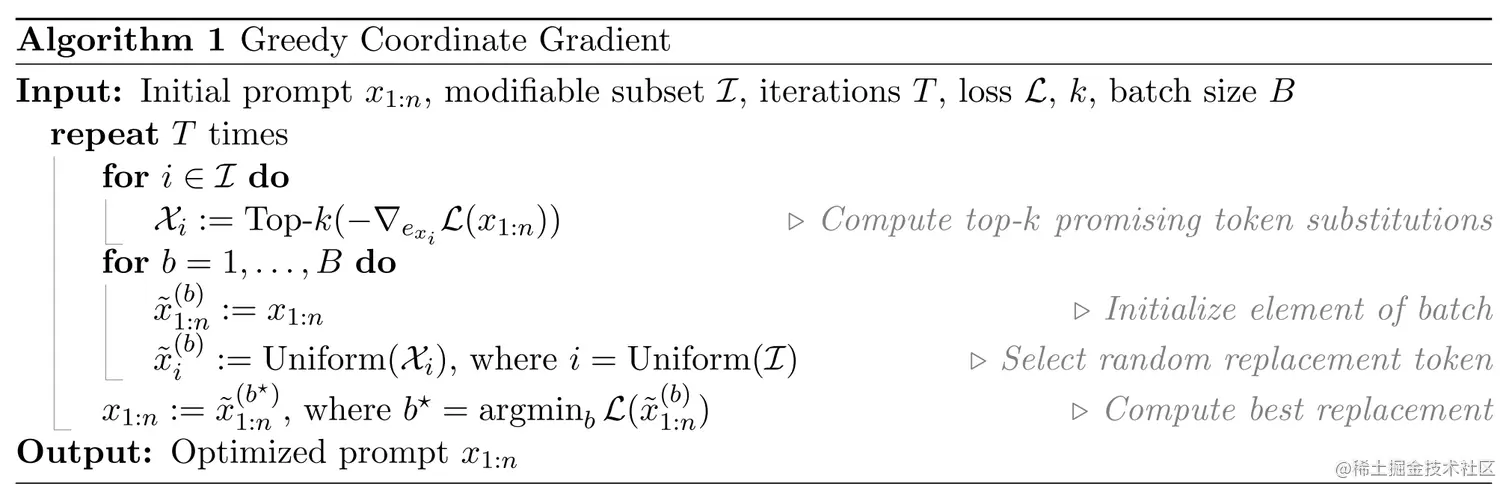 由于需要在离散的Token上优化以提高攻击成功率。通过使用词元级别的梯度,找出有潜力的替换方法,评估并选择最优的。类似于AutoPrompt方法,但我们在每步都搜索所有可能的替换,而不只是一个。