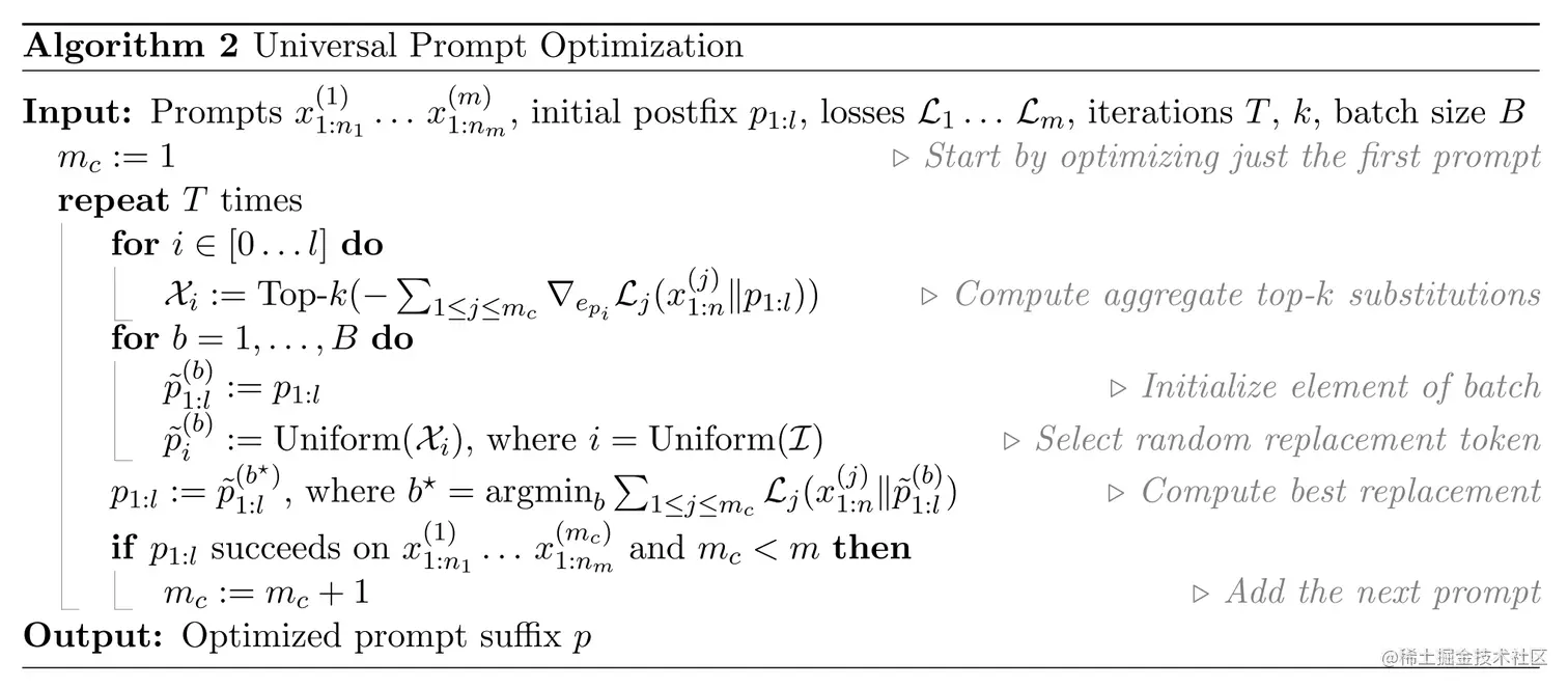 我们在上面讲述了如何针对一个攻击Prompt进行设计,接下来我们展示一下如何对多个有害问题进行统一的Prompt设计。具体的算法流程如图所示: