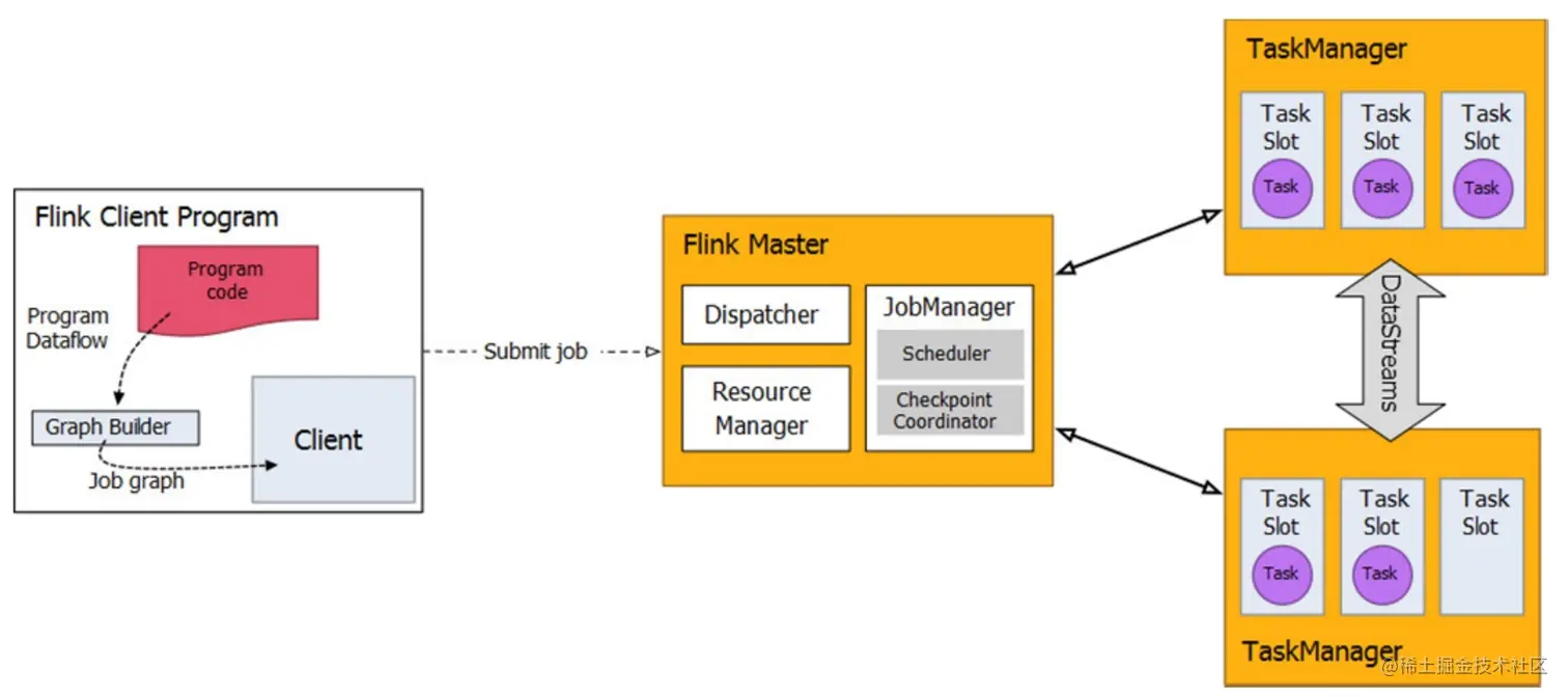 - TaskManager在执行计算任务的过程中可能会与其他TaskManager交换数据,会使用相应的数据交换策略。同时,TaskManager也会将一些任务状态信息反馈给JobManager,这些信息包括任务启动、运行或终止的状态、快照的元数据等。
