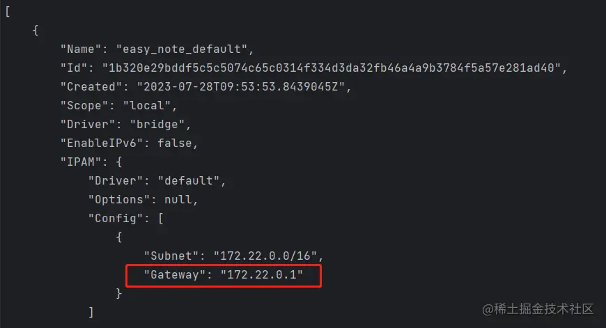 但第五步我们用 easy_note 网络创建了容器,同样 inspect 一下