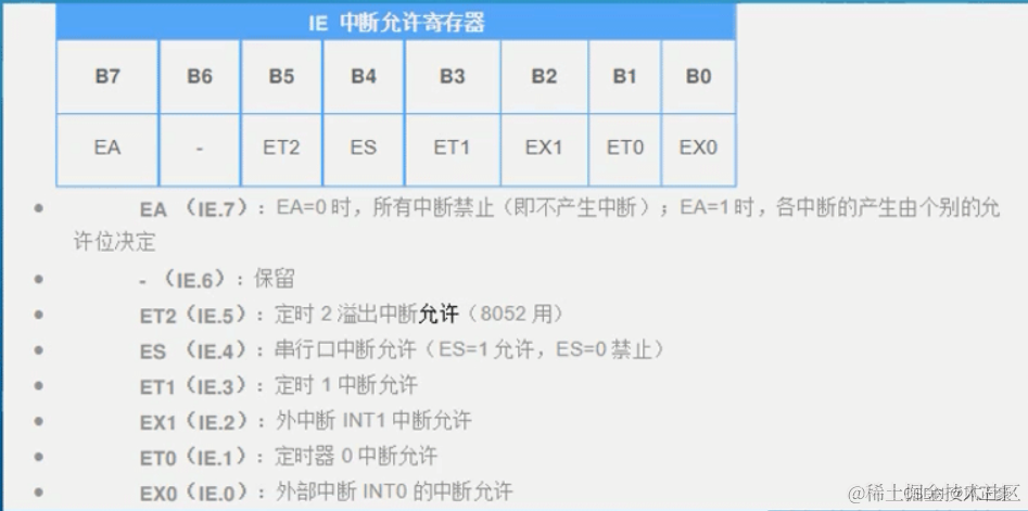 但是这个时候有人又会觉得,感觉上面所说的不足以让他信服。据我所知,枚举常量在嵌入式中出现比较方便。看下面图片,我们有一个IE中断运行寄存器。从最低位B0到最高位B7,有七个bit位。每一位表示进行一个操作,很明显我们难以记下来。那怎么办呢?枚举就是最好的办法