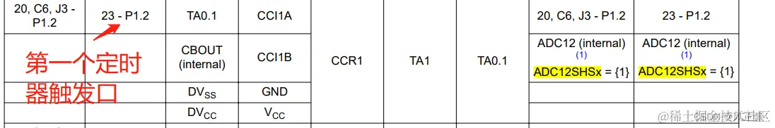 至于我们想知道这个ADC12SHSx的定时器采集是哪几个定时器,不同芯片情况不同,我们需要看引脚功能数据表,按Ctrl+F搜索ADC12SHSx即可出现如下(注意,我这里只提供MSP430F5529的,其他型号的自己去找)。