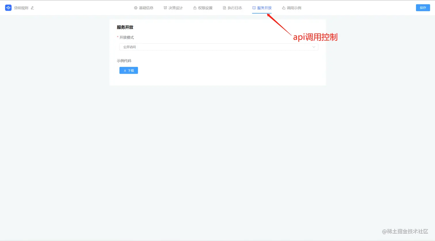 服务开放控制,主要是针对外部的程序或者外部接口调用本决策的授权控制,如下图所示