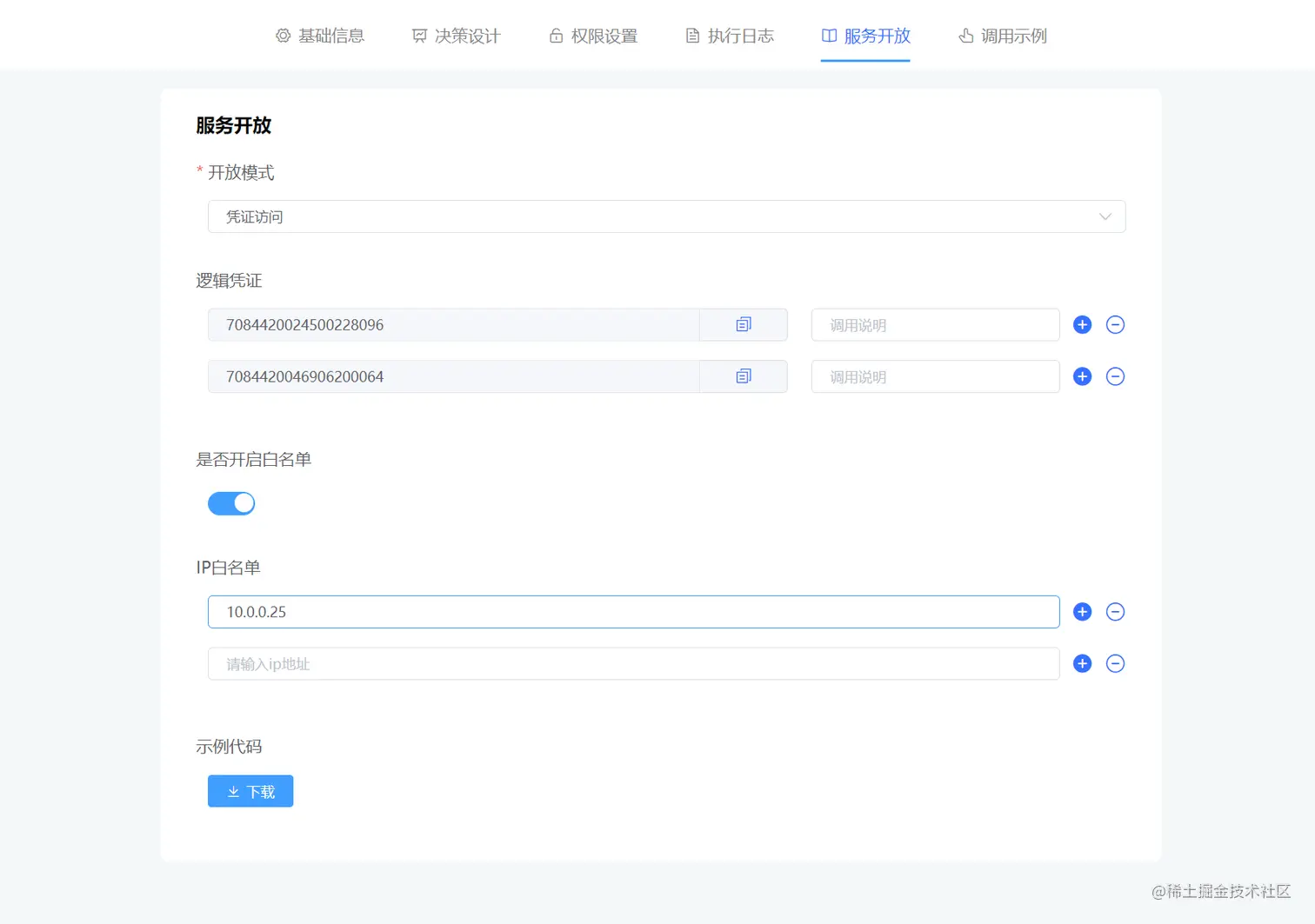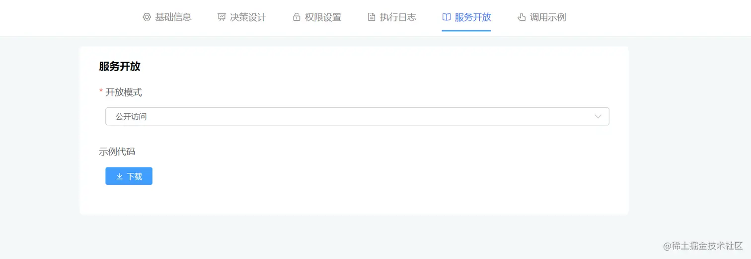 在页面中,可以配置不同的开放模式:公开访问、凭证访问,其中公开访问是不对调用访问进行控制,凭证访问是表示对调用本决策的api必须携带调用的凭证,否则将不被允许调用