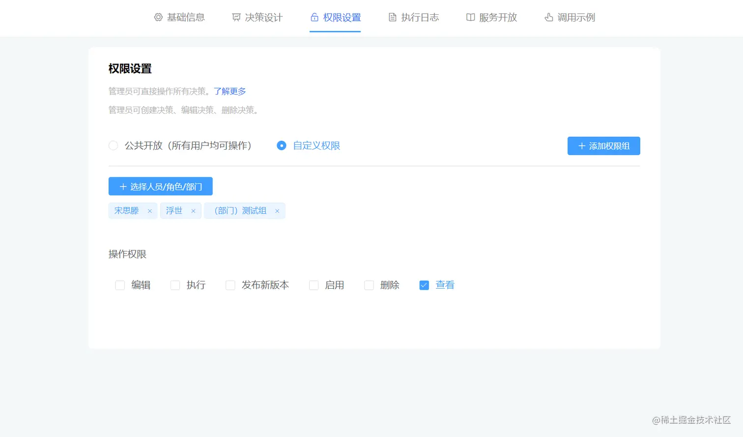 - 查看权限,表示可以对本决策流的配置与执行结果进行查看。