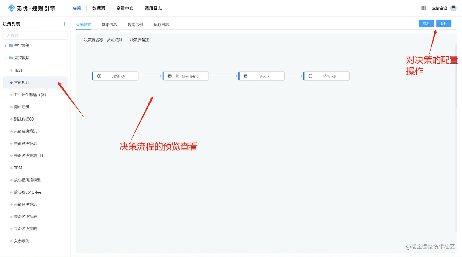 1、新增、或者对现有决策流程进行编辑,进入到决策配置界面,如下图所示,配置引擎包括两个页面,“权限设置”页面用于对配置的决策流设计进行权限控制