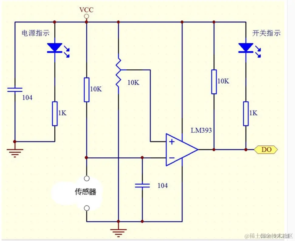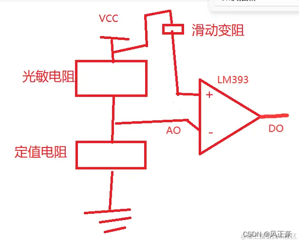 我们又知道DO的电压值会随着光线的大小变化。那么我们将DO的值输入到LM393比较芯片中去,LM393就可以根据DO的电压值和滑动变阻器的分压值进行对比,最后决定输出是高电平还是低电平。
