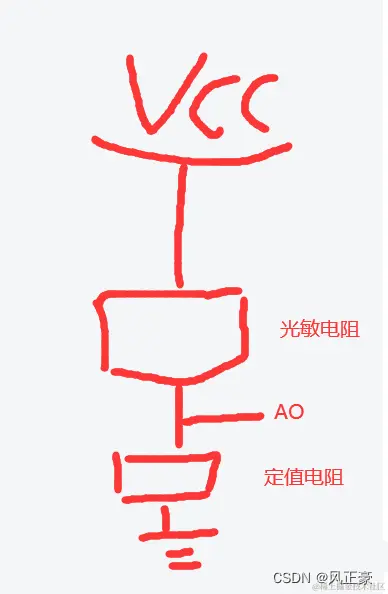 首先我们需要知道一个概念,就是很多传感器其实就是一个定值电阻,加上一个对某一种信号敏感的电阻。比如光感,就是一个光敏电阻和一个定值电阻,如下图。