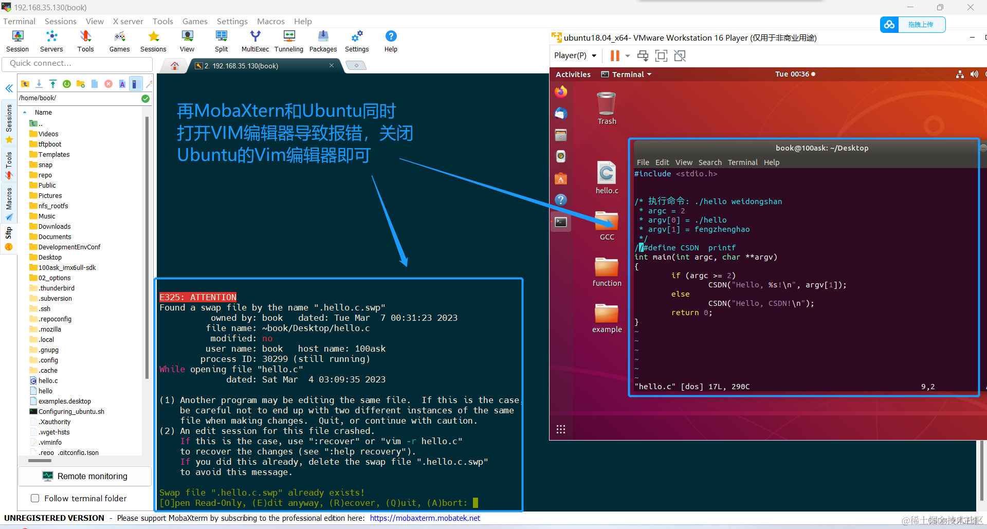 可能有很多人喜欢使用MobaXterm远程控制Ubuntu。而在Ubuntu中使用vi命令打开了文件,却忘记关闭了。这样会导致MobaXterm再使用vi打开文件报错。 只需要关闭Ubuntu中的VIM编辑器即可。