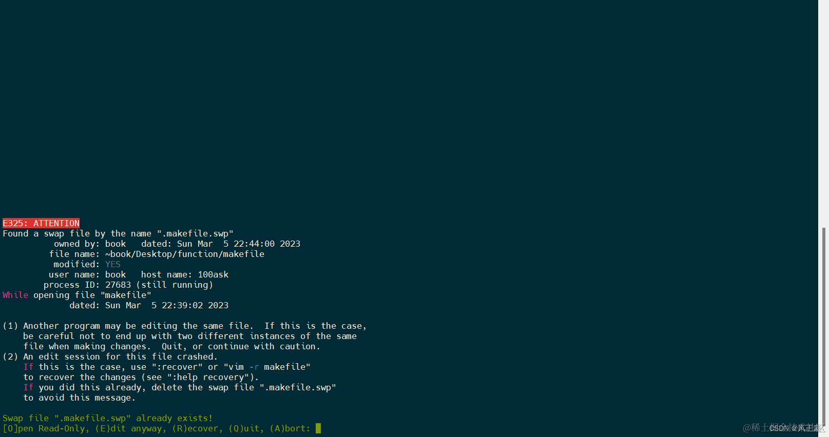 对于新手使用Makefile,有时候使用vi命令打开Makefile会出现E325: ATTENTION报错,而只要出现了一次,之后每次使用vi命令打开相同的Makefile都会出现这个报错。