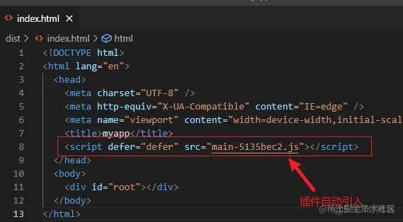 打包后发现dist下多了index.html 并且改文件中自动引入了js文件