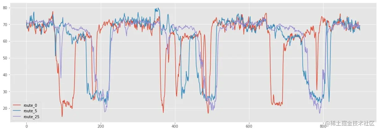 下图为随机挑选的 3 个传感器采集的三天通行速度曲线。图中纵坐标为通行速度,单位是 km/h。横坐标是时间,每个点代表 5 分钟。从图中很容易看出每个传感器所在路段的通行速度随一天时间变化都有比较明显的规律,但不同路段各自的规律又有明显的差别。