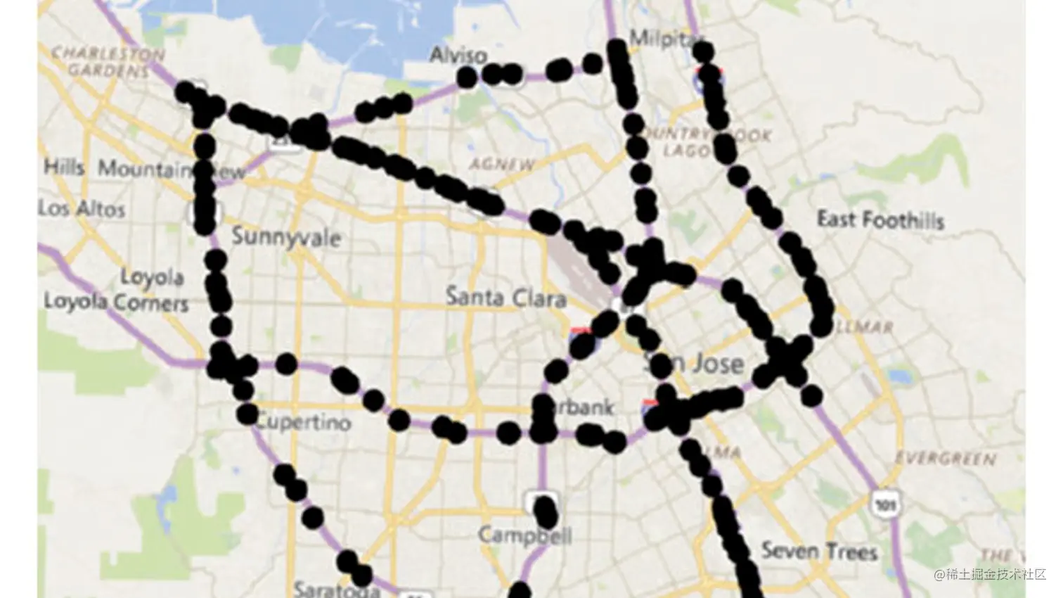 本文本例中采用的 PeMSD7 子集,其中包含了加州第七区 (District 7) 的高速公路网中设置的 228 个速度传感器采集到的 44 个工作日的数据,这些传感器每 30 秒采集一次所在路段的通过速度,最终的数据则是通行速度每 5 分钟的平均值。
